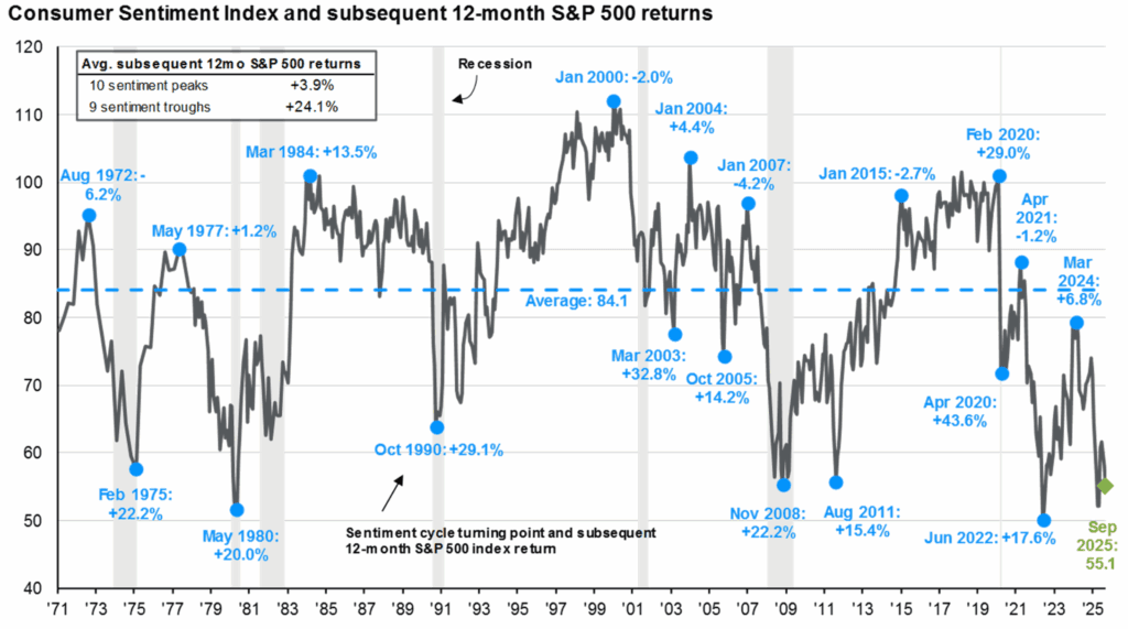 What an interesting year! It seems that the disconnect between the economy and the market is unusually large. Consumer sentiment is near an all-time low while the U.S. stock market is at an all-time high! It is usually better to invest when sentiment is low rather than when it is high.
