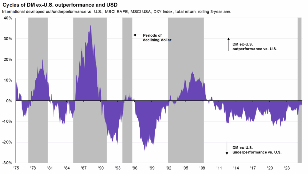 - U.S. Dollar declined by 10.6% versus other global currencies when President Trump announced his tariff plan (raised inflation expectations and reduced growth expectations) and investors anticipated that the Fed would cut rates. For these reasons, many expect the value of the dollar to continue to decline over time.
