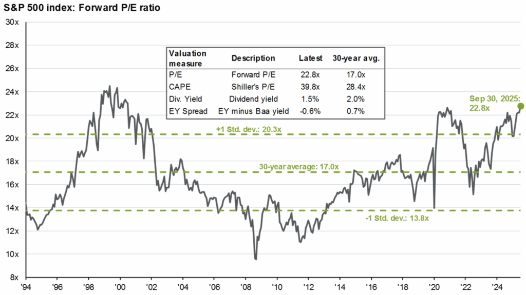 - Left chart below shows S&P 500 ended Q3 at 22.8 times earnings which is historically high