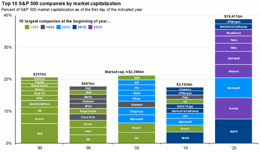 - The chart below shows the ten largest companies by market cap over the last five decades