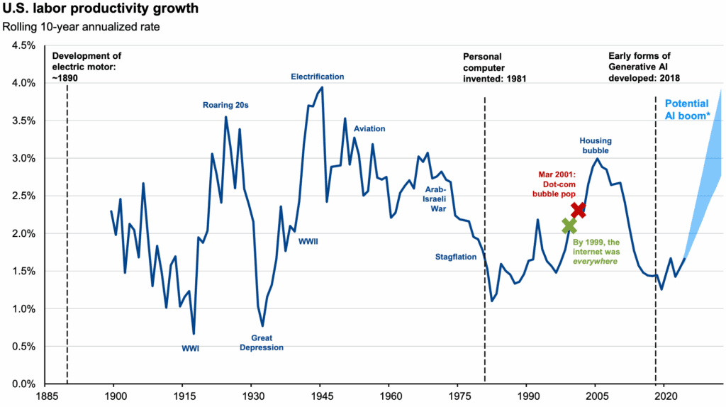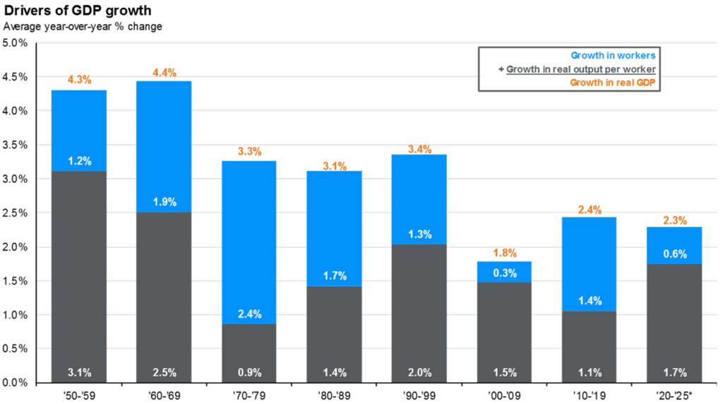 - Labor force productivity becomes a key driver of growth with expectations that AI will be a major driver (right chart below)