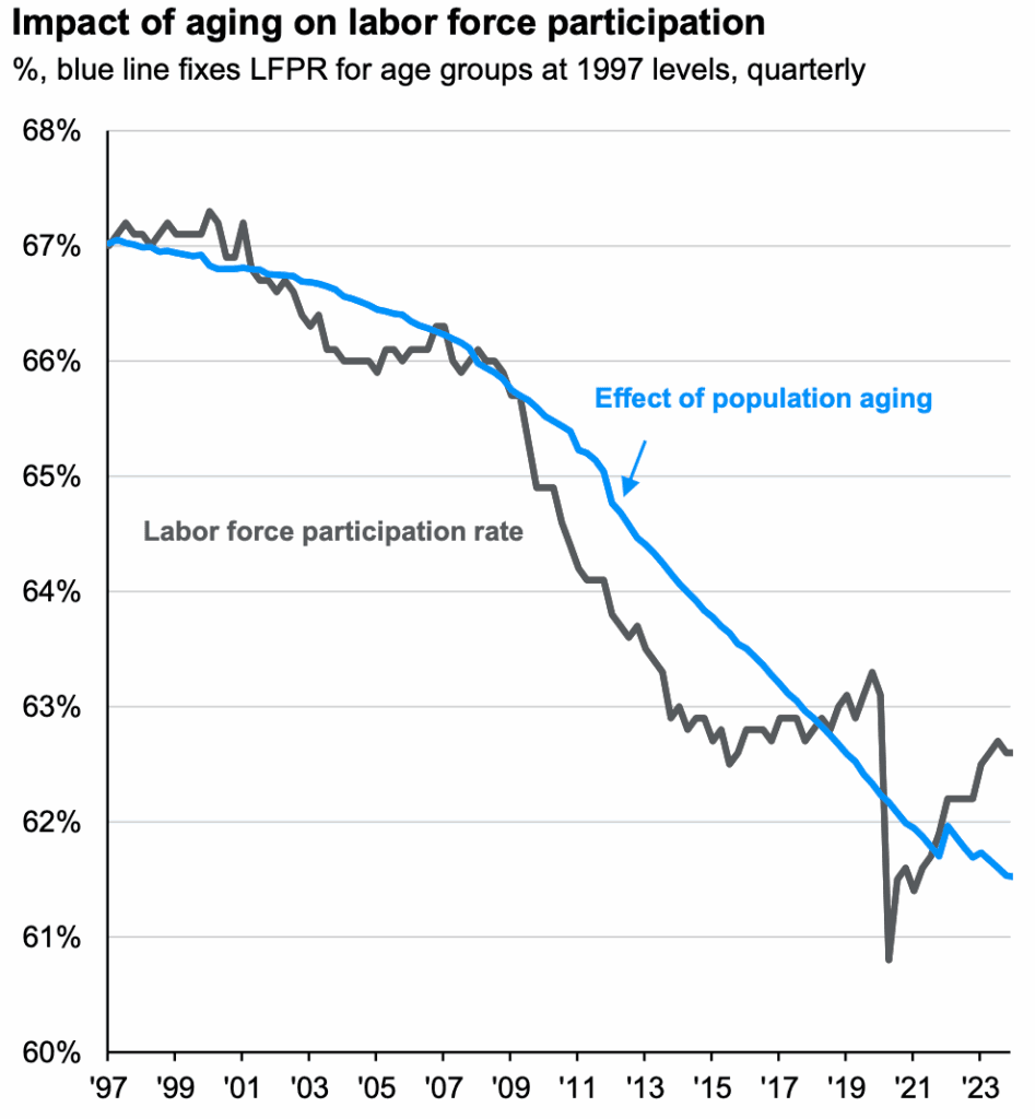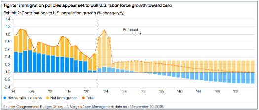 - Immigration and Demographics: Tight immigration policy and demographics are contributing to tight Labor force supply Our current path is leading to zero U.S. labor force growth, causing economists to reduce their economic growth forecasts.