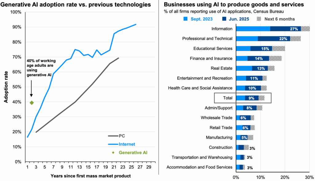 - The adoption of AI technology so far has been extremely rapid, yet with plenty of room left for businesses to figure out how to use the technology to drive down their costs (left chart below)