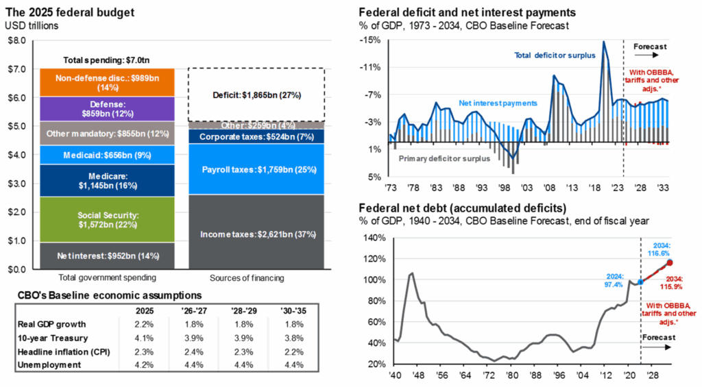 - Fiscal pressures and high real interest rates are expected to keep US bond yields elevated.